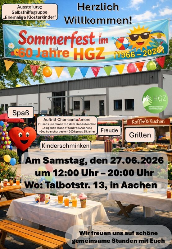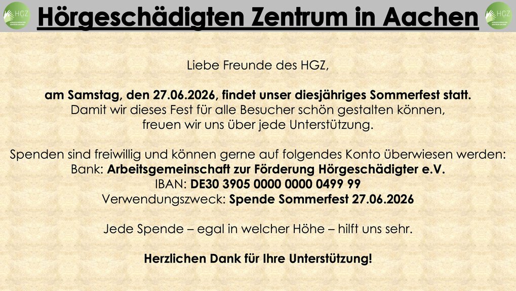 Hörschädigung kann jeden treffen. Hörschädigung nimmt in unserer Gesellschaft sogar zu. Deshalb hat die Arbeitsgemeinschaft zur Förderung Hörgeschädigter e.V.sich das Ziel gesetzt, diese Menschen zu unterstützen. Sie hat für die gehörlosen und schwerhörigen Menschen aus dem Großraum Aachen ein Zentrum das Hörgeschädigtenzentrum (HGZ) – errichtet.